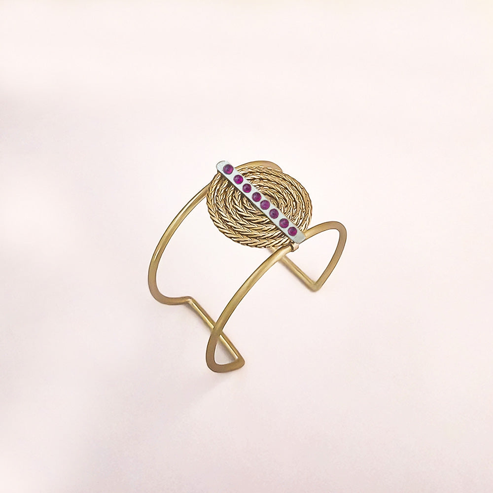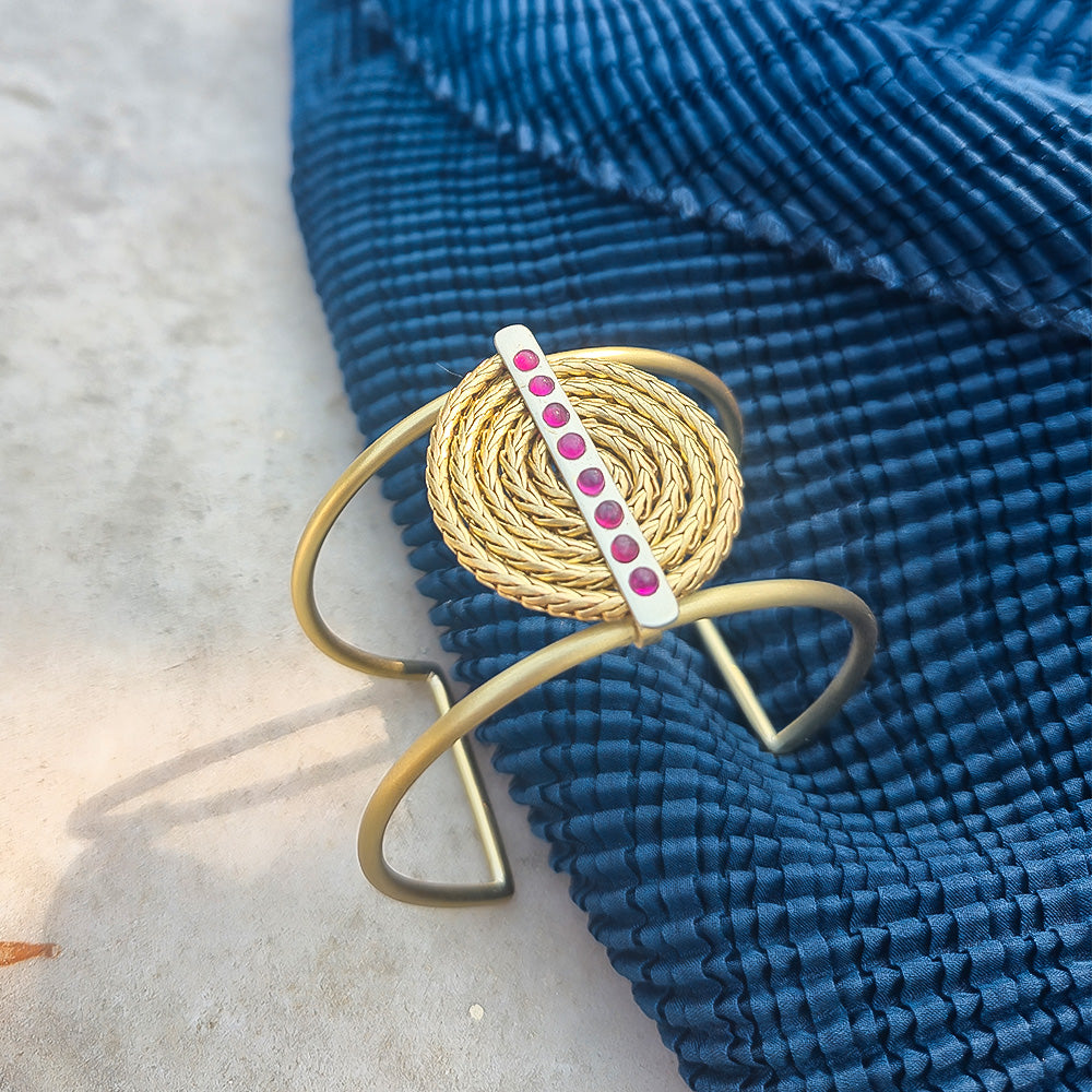 Channel your inner high priestess with this handcrafted brass cuff featuring a mesmerizing concentric spiral and a strike of German silver. Studded with genuine rubies, it’s the ultimate bold statement jewelry for anyone who wants their wrist to do the negotiating while they sip an espresso.