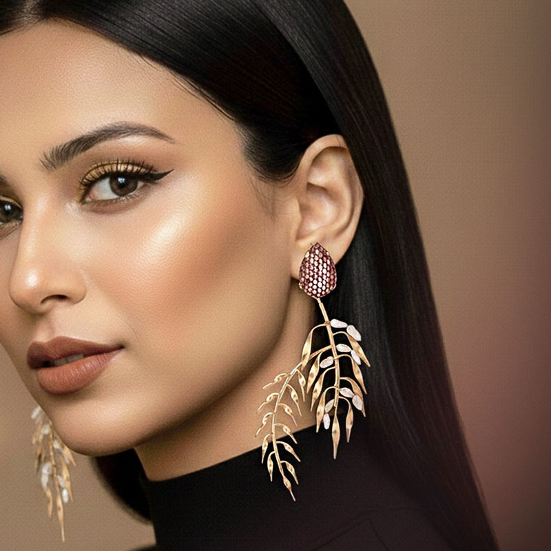 Soft-blush, leaf-drop stud earrings meet a cascading effect, with equal parts glow and drama. This is artisan handmade jewelry with 22K gold plating and silver plating. Perfect with slick hair and a satin slip dress for evenings out.