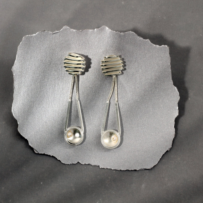 SILVER PLATED ROUND WRAPPED METAL,CHAIN, WIRE AND KATURI EARRING WITH PEARL