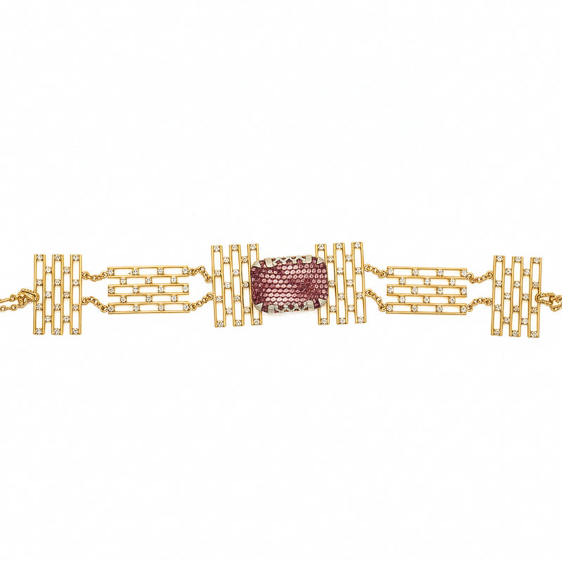 A clean, controlled, and undeniably glamorous choker necklace with structured links that echo the geometry of harvested fields, anchored by a deep-toned crystal that glows under low light. Handcrafted jewelry by expert artisans in 22K gold plating and crystals.