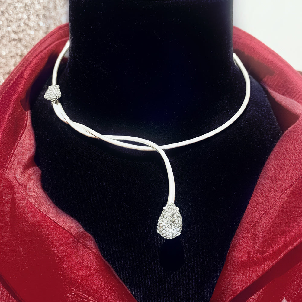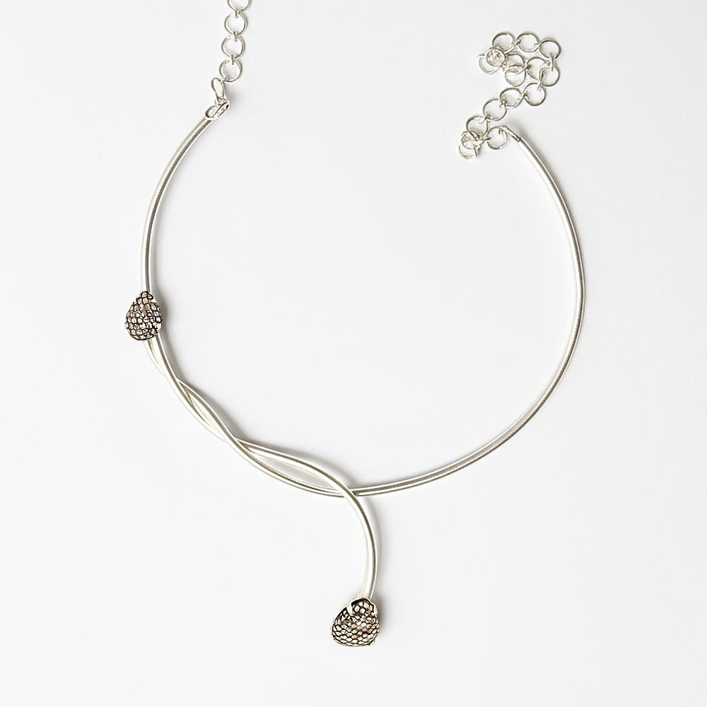 A fluid silver choker that catches the light like dew settling on fields after sunset. Handmade jewelry for evenings that stretch longer than planned.