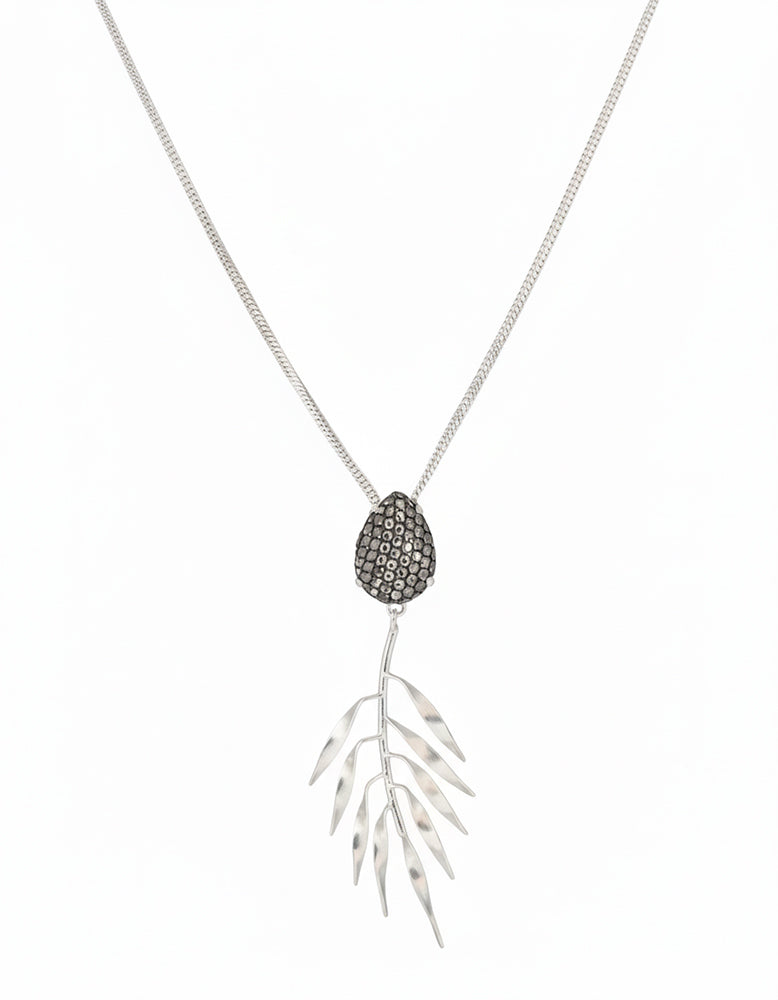 A shimmering silver pendant crowned with a textured bead and falling grass flowers. Adjustable and handmade by expert artisans.
