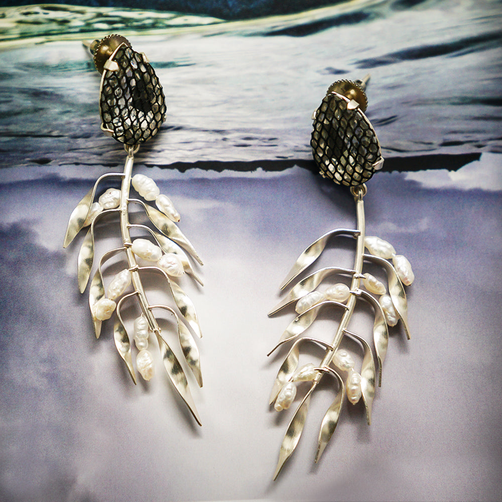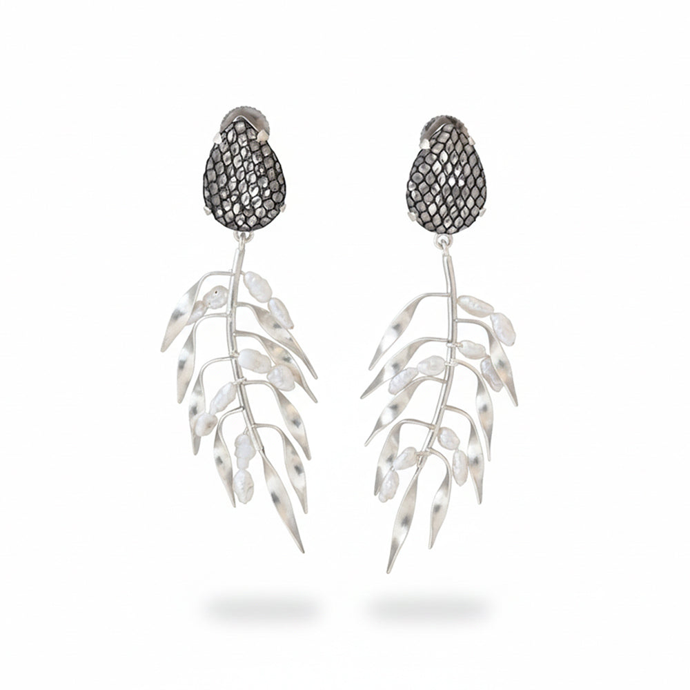 Silver plated leaves in wheatgrass designs cascade to form unapologetically bold statement earrings. Stand out with a sleek ponytail or wet hair look. Leave out the necklace.