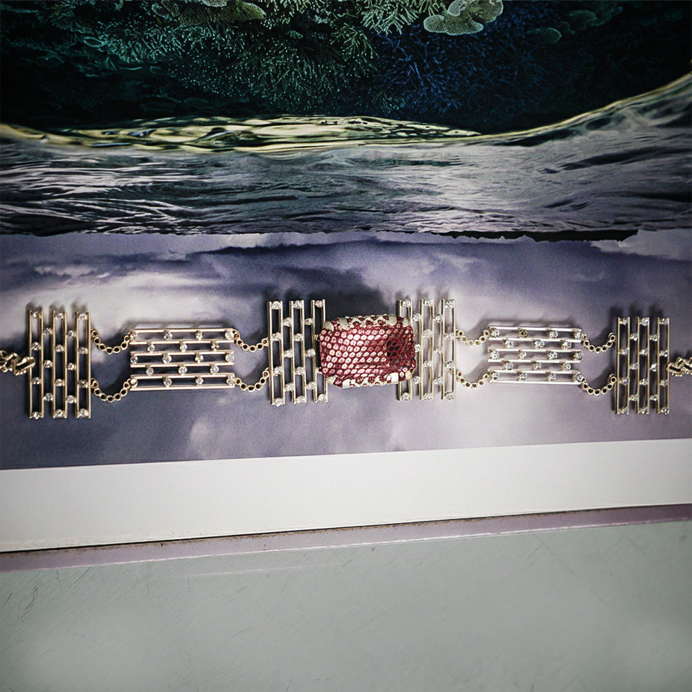 A grid-design silver choker necklace with architectural links and warm rose accents. Adjustable for easy styling, this bejeweled neckpiece shimmers with industrial chic softened by sunlit hues.