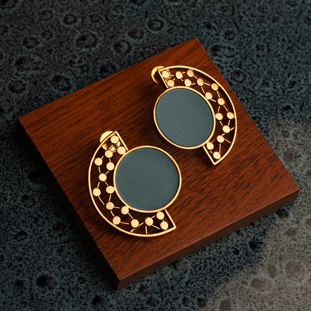 These dainty stud earrings are handmade from gold-toned copper and enhanced with a cyan blue acrylic at its centre.