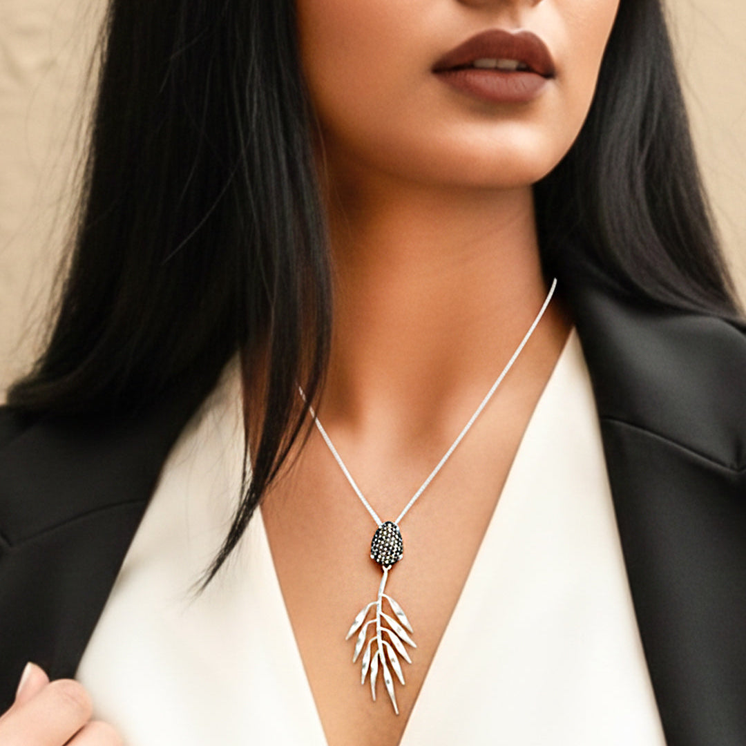 A shimmering silver pendant crowned with a textured bead and falling grass flowers. Adjustable and handmade by expert artisans.