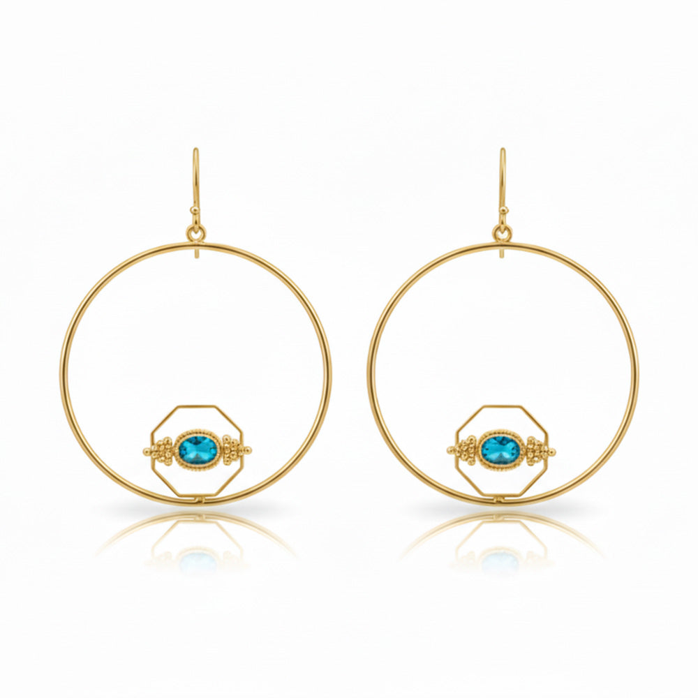 Style Tip: These modern statement earrings pop against neutral tones. Try it with a sleek black jumpsuit or an olive-green romper to make that center stone truly sizzle.